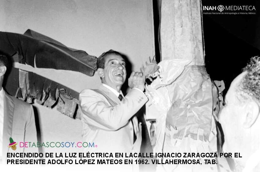 El presidente de la República Adolfo López Mateos acompañado por el Gobernador de Tabasco Carlos A. Madrazo, inauguró la iluminación de la calle Zaragoza en 1962.