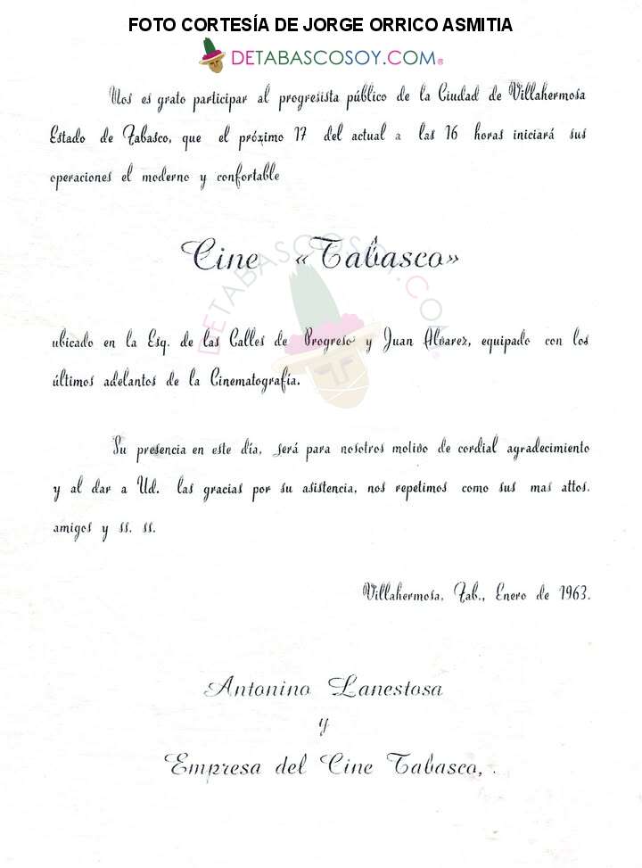 El 17 de enero de 1963 se inaugura el Cine Tabasco en las calles de Castillo y Bastar Zosaya, propiedad e Antonino Lanestosa Cárdenas, con la película Rey de reyes (1961) y Psicosis (|960). Este cine el primero equipado con clima artificial y contaba con mil cuatrocientas butacas.