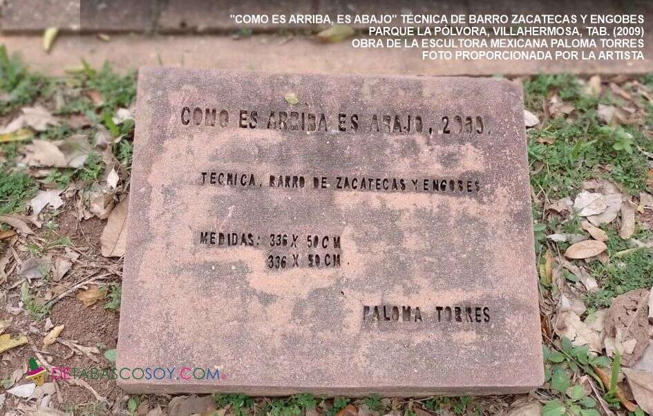 Esta trabajo de Paloma Torres refleja perfectamente su vinculación del urbanismo y los materiales de la tierra. “Como es arriba es abajo” se encuentra en el interior del parque “La Pólvora” en Villahermosa, Tabasco. Está elaborada en técnica de barro zacatecas y engobes, consiste en dos piezas, cada una de las cuales tiene medidas de 336X50cm, una placa en el suelo en piedra da a conocer su nombre y autor.