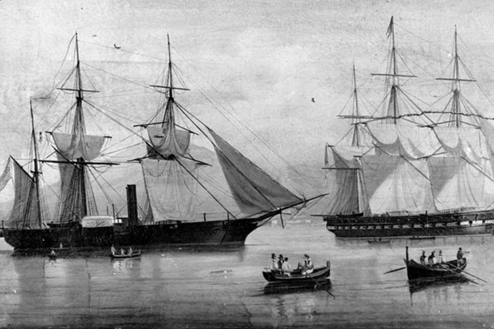Al comodoro le plantean la misión de ir a abrir este nuevo mercado, a lo que él en 1852 se embarca con sus “negras fragatas” de vapor hacia este lejano puerto.