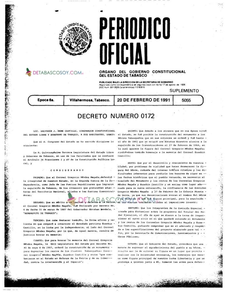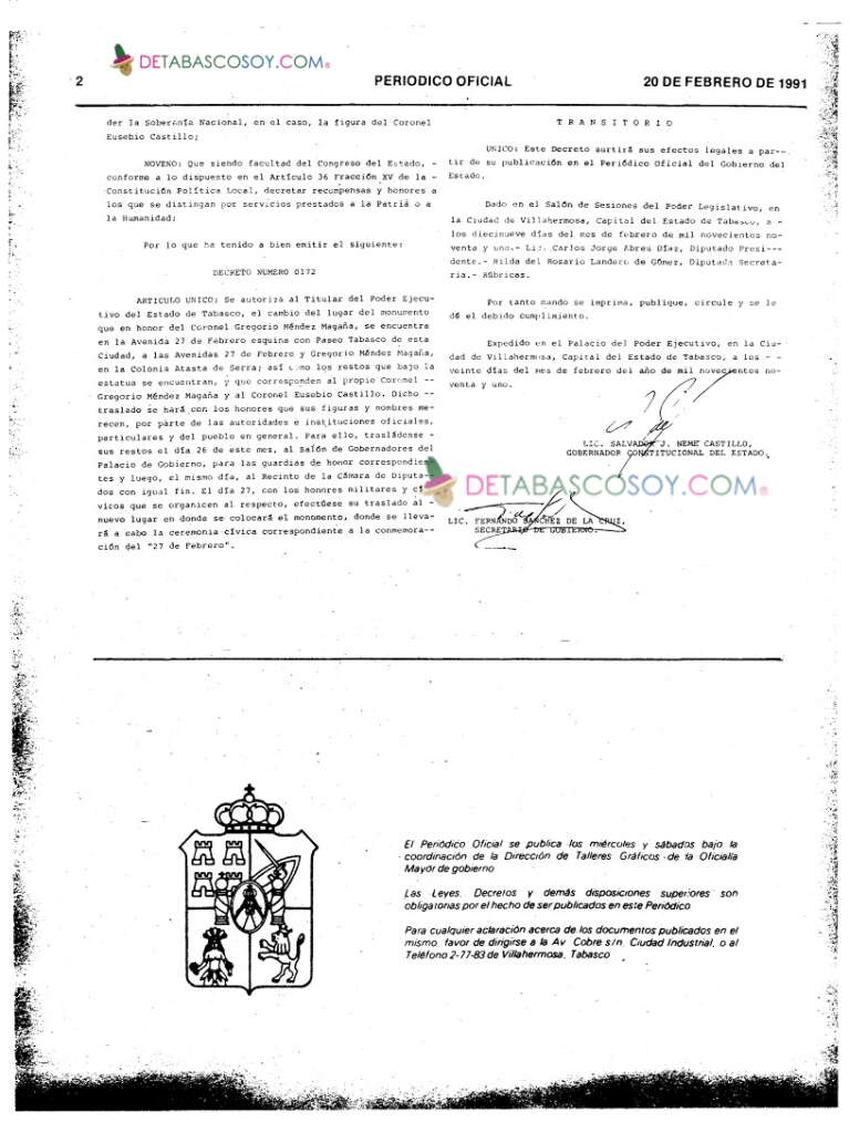 En el periódico oficial del 20 de febrero de 1991, suplemento 5055, el Congreso decreta que el 27 de febrero de ese mismo año se traslade el monumento con los restos del Crnl. Gregorio Méndez y del Crnl. Eusebio Castillo a su nueva ubicación en avenida Méndez con 27 de Febrero con los honores y homenaje cívico que merecen. Esta es su ubicación actual..